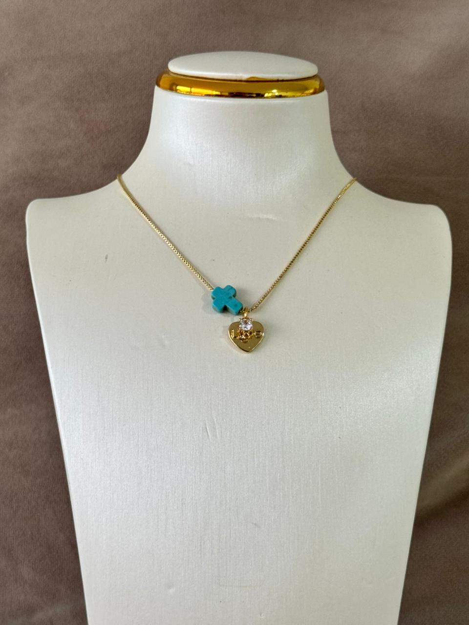 Collar ajustable con dije de corazón y cruz de piedra turquesa