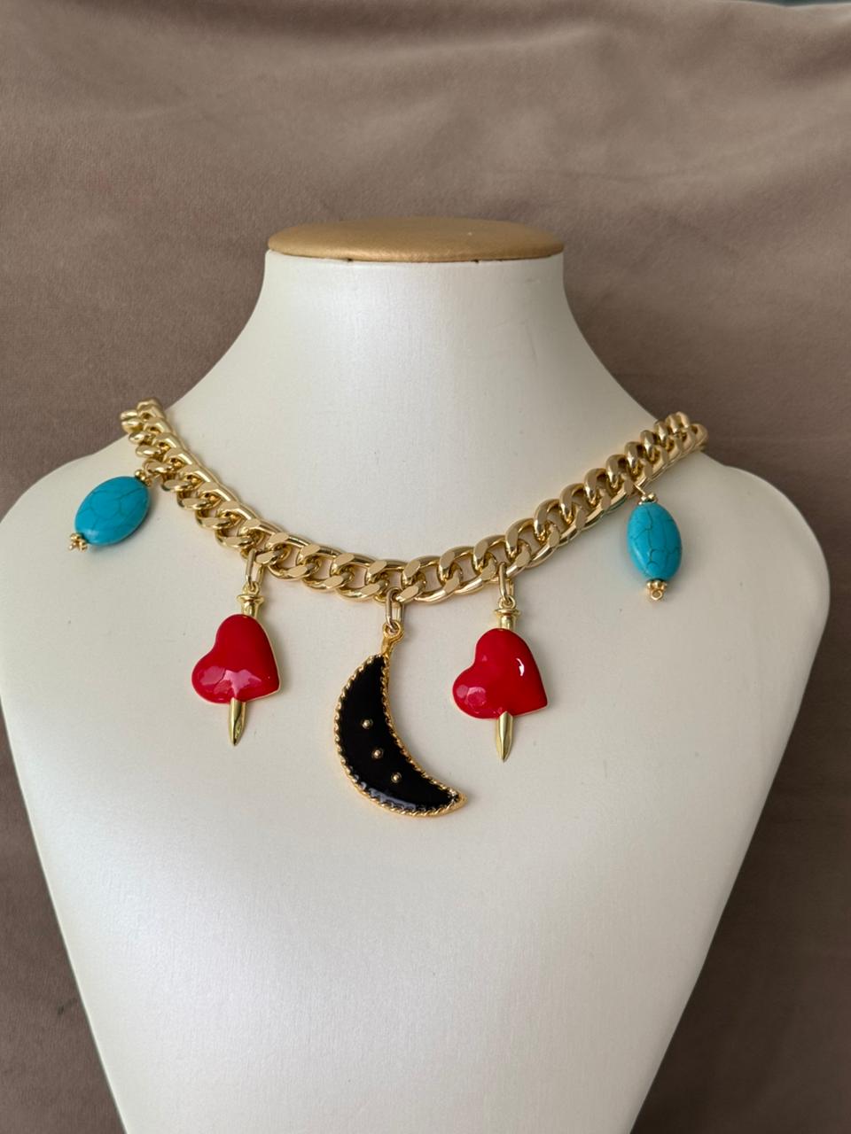 Collar, Gargantilla eslabón con dijes de luna, corazón y piedras turquesa